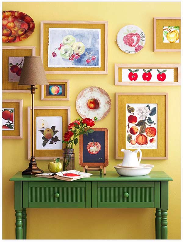 Odlučite se za jedan motiv koji vam je zanimljiv, ovdje su prikazane jabuke, ali to može biti i neko drugo voće, cvijet ili npr. mace ako ih volite. Objesite na zid sve stvarčice koje vam se učine zanimljivim. Na slici su umjetničke slike, ručni rad, poslužavnik, reprodukcije i porculanski tanjur sa samo jednom temom – jabukama! Možete staviti i vlastite fotografije.